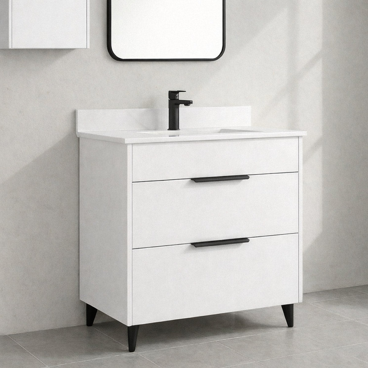 - White Quartz top, pre-drilled for single hole faucet