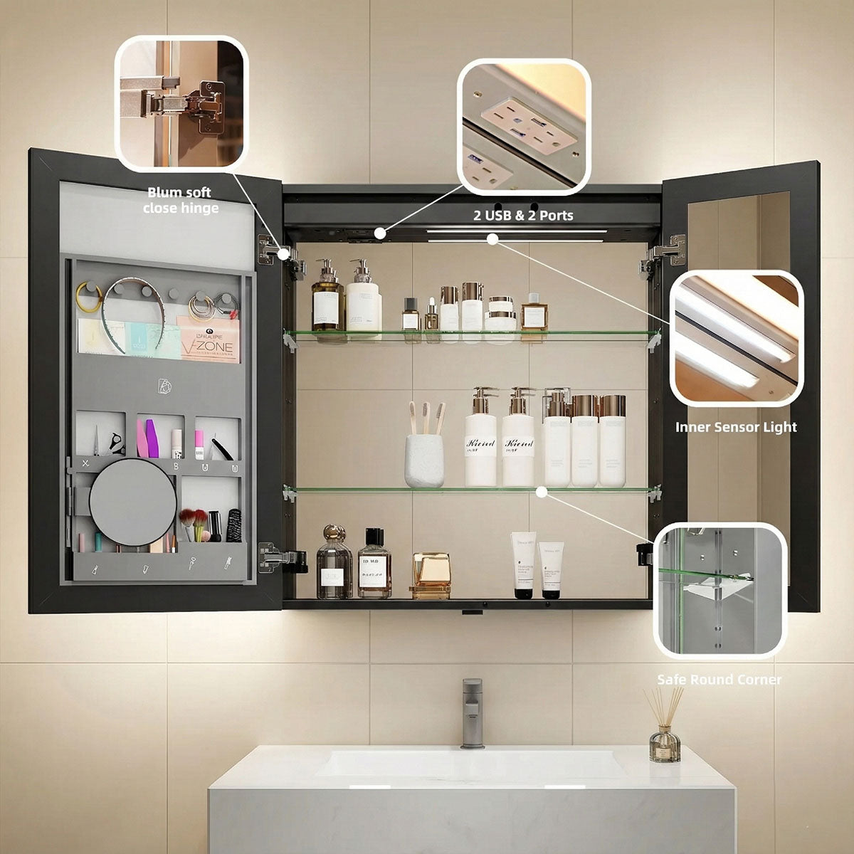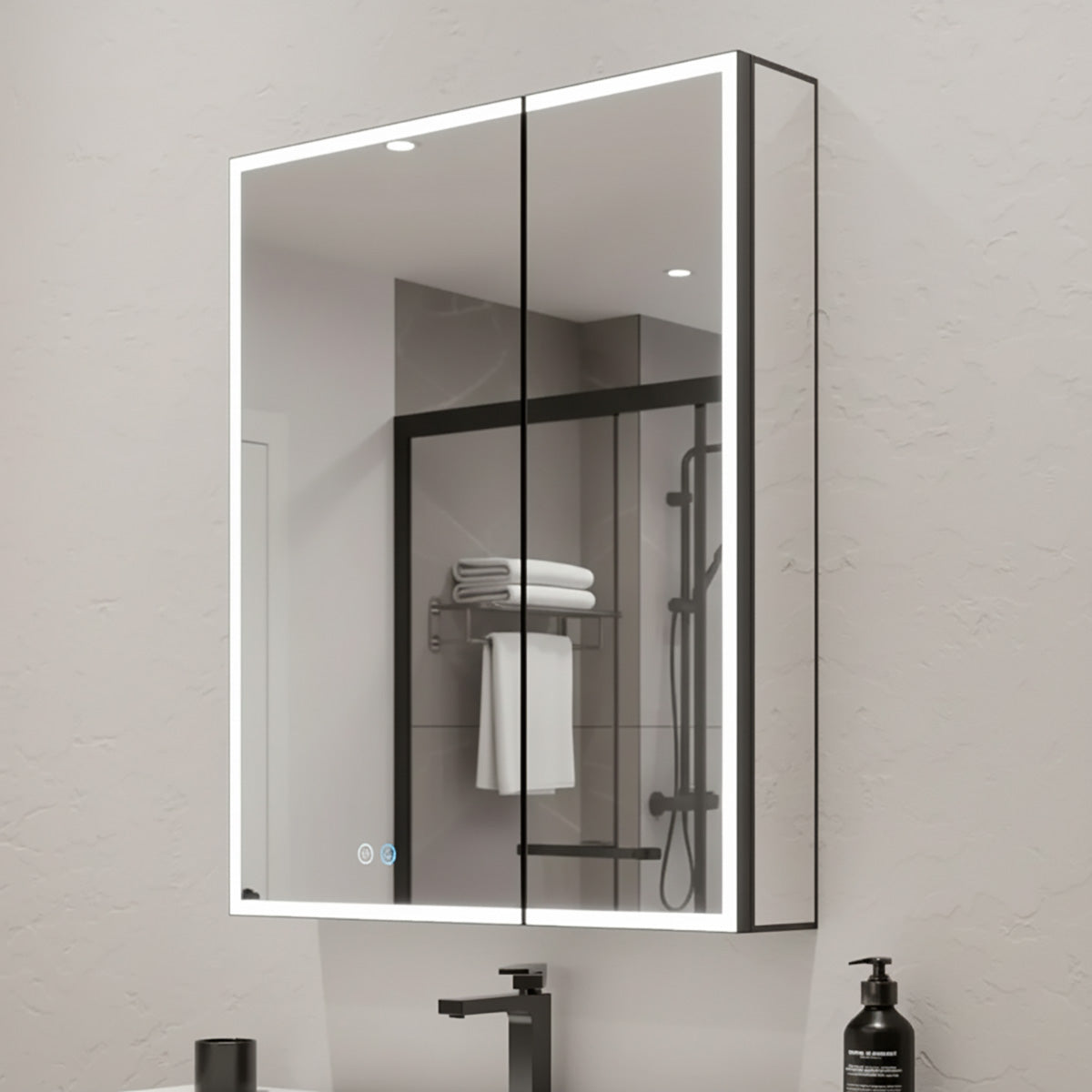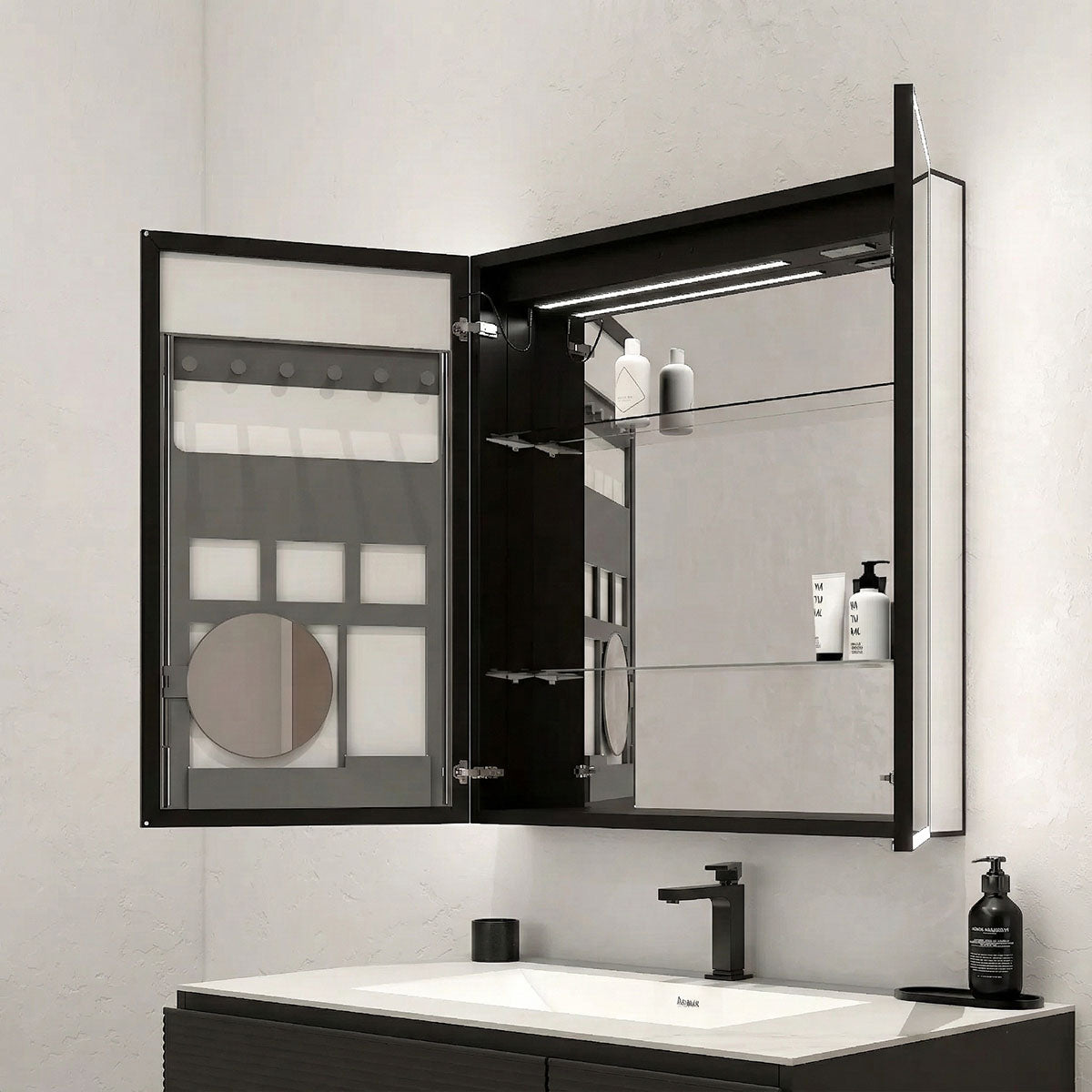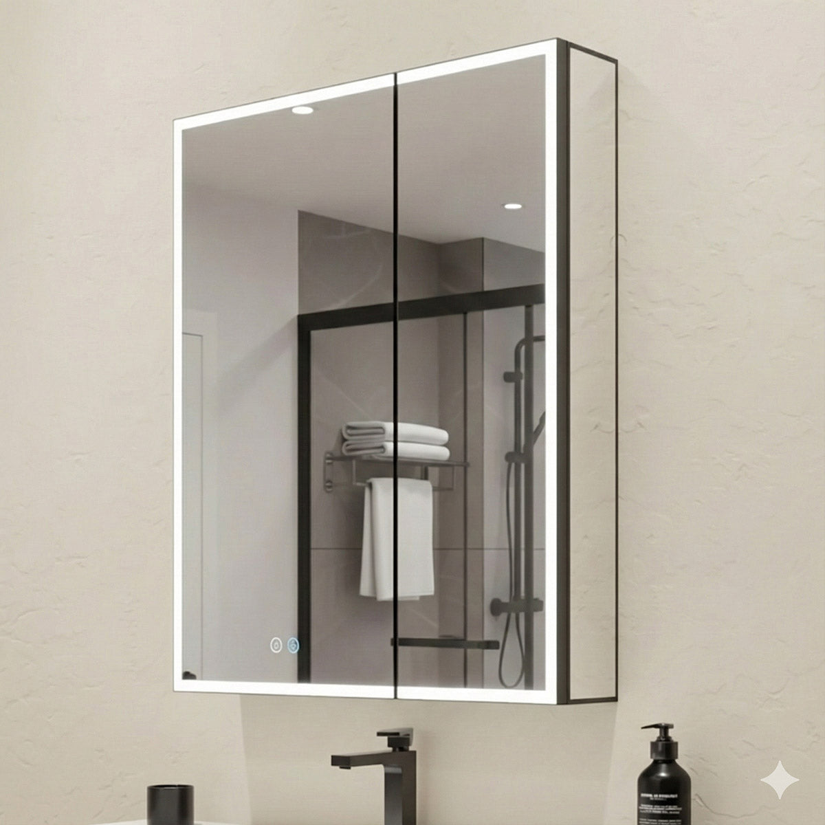 - LED mirror medicine cabinet with soft-close mirrored doors