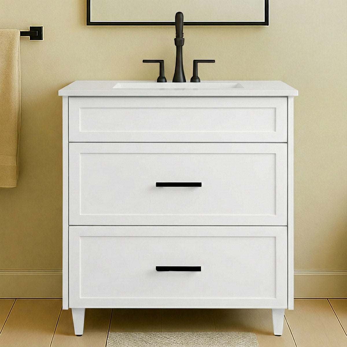 - Top and bottom drawers have cut-outs to accommodate plumbing.
